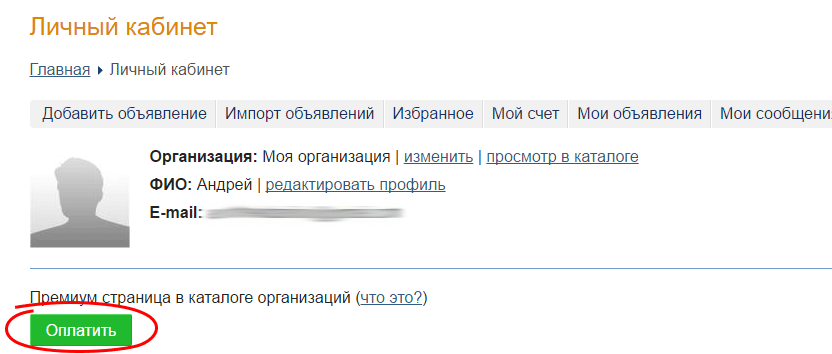 В разделе "Премиум страница в каталоге организаций" нажмите кнопку "Оплатить/Продлить"