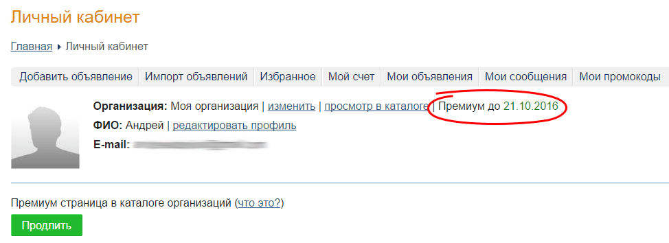 В личном кабинете напротив наименования организации Вы увидите до какого числа активна премиум страница.